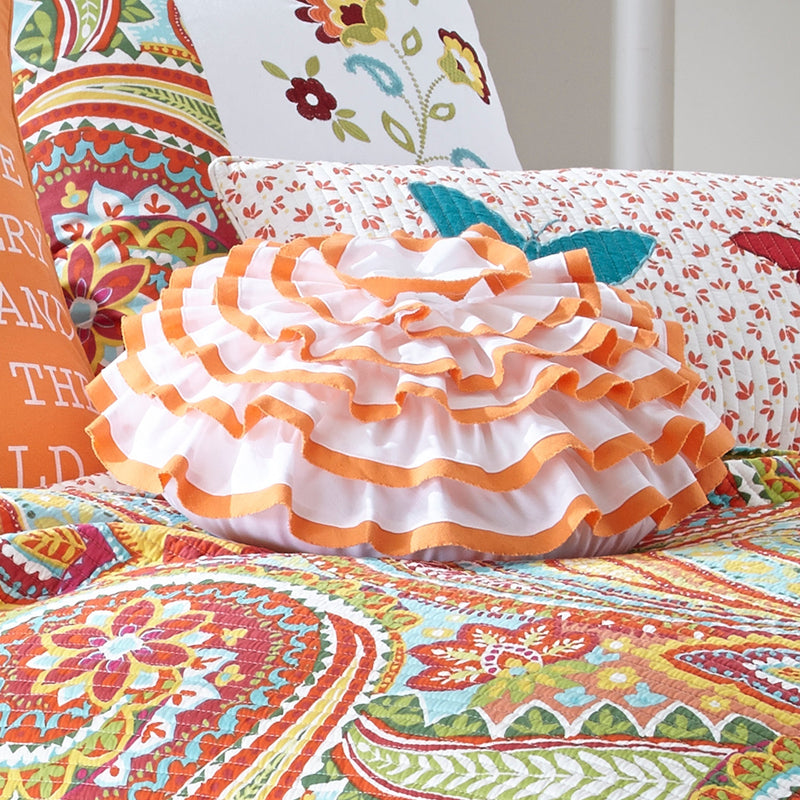 The Orange Blossom decorative pillow matches perfectly with the Levtex Home Sylvie bedding collection. This round pillow is sized at 17in. across, and features gorgeous orange and white flower blossom-inspired ruffled design. The bright color palette makes this a versatile accessory for your bed, couch or favorite chair. The pillow comes pre-filled with a soft, luxurious feather inner.