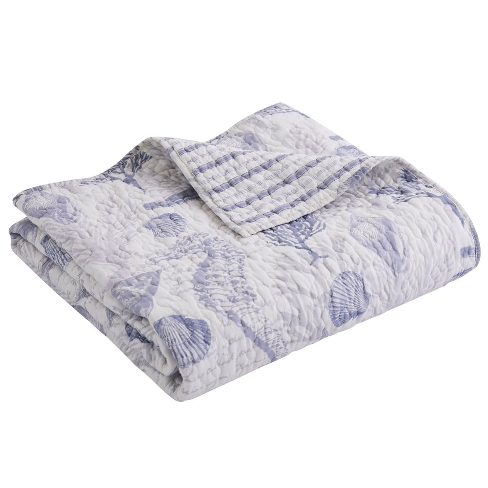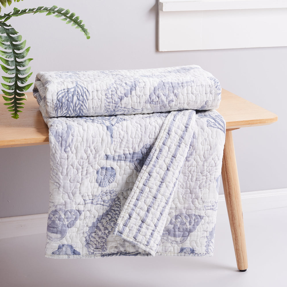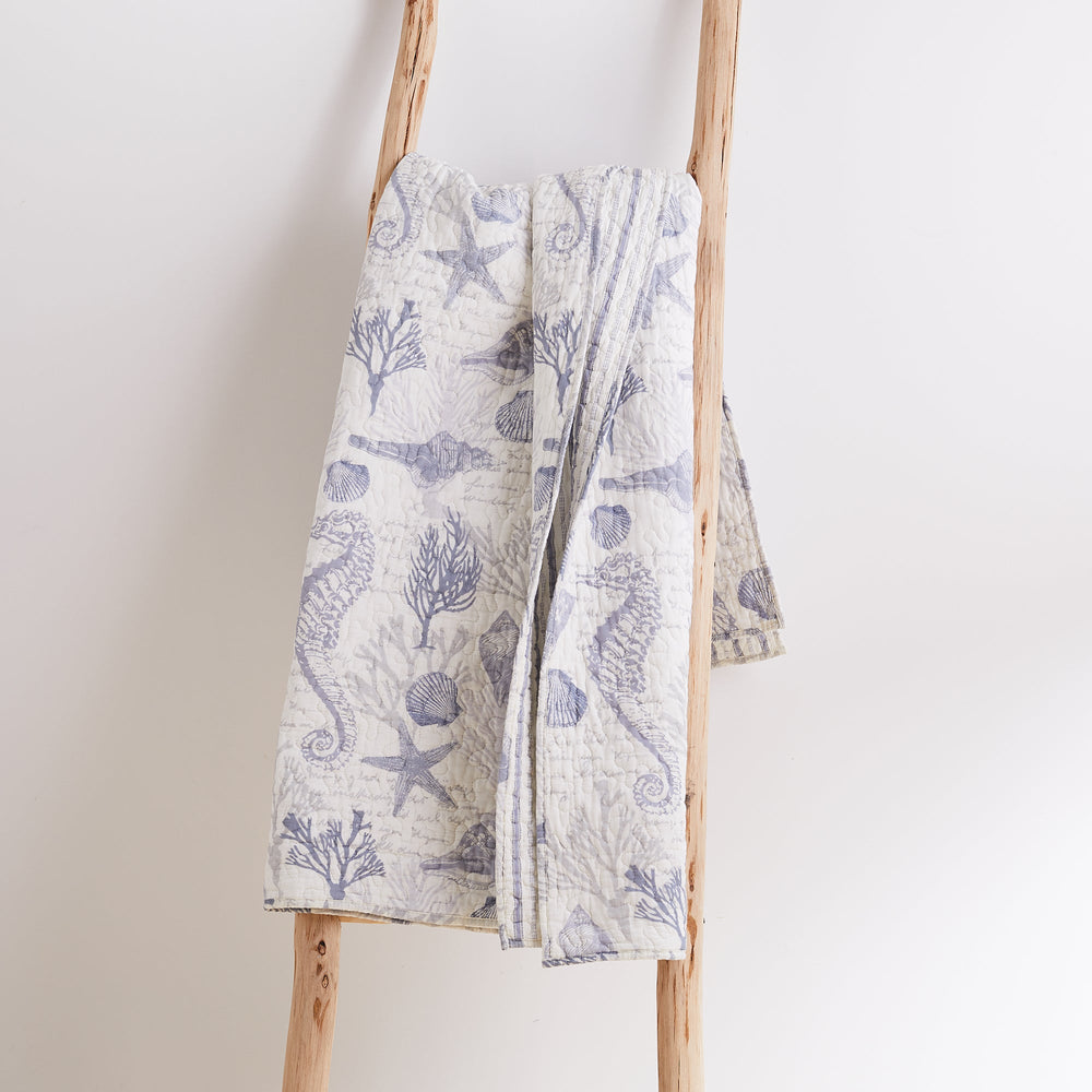 The Tahiti Reversible Quilted Throw by Levtex Home is inspired by a snorkeling trip on a gorgeous coral reef. This intricate coastal design will immediately transform your bedroom. Made with the softest lightweight cotton, this reversible throw features a seahorses, shell and coral in shades of grey and blue on a white ground, reversing to a blue and white stripe on the other. The Quilted Throw is perfectly sized at 50x60in., is machine washable and is filled with a cotton-rich filler (that includes cotton, polyester and other fibers). Enjoy this for years to come!
