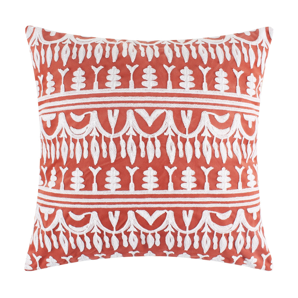 The Embroidered decorative pillow matches perfectly with the Levtex Home Tamiya bedding collection. This pillow is sized at 18x18in. and features a beautifully embroidered mosaic mirrored white design on a red ground.? The red and cream color palette makes this a versatile accessory for your bed, couch or favorite chair. The pillow comes pre-filled with a soft, luxurious feather inner.