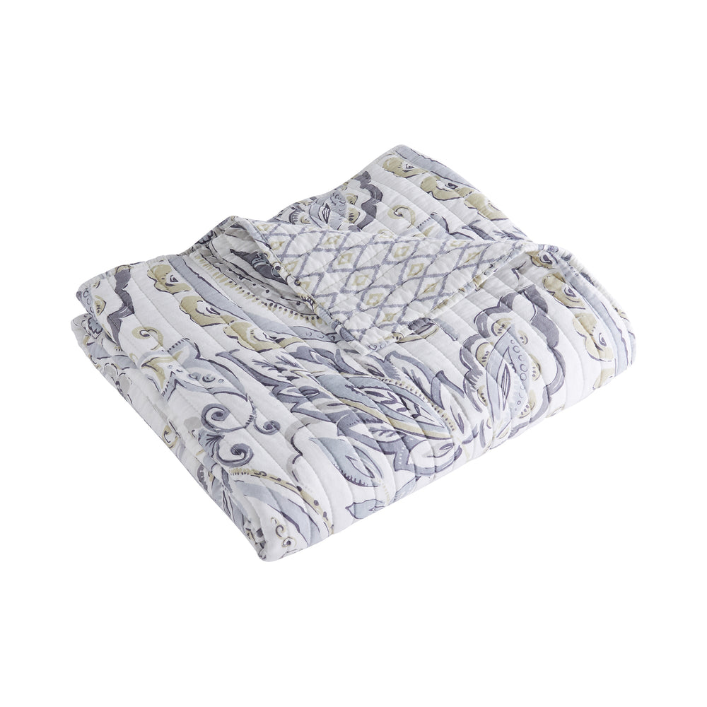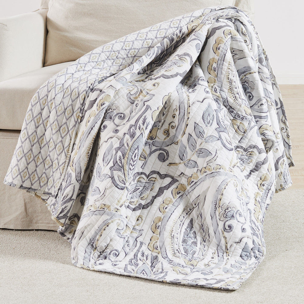 The Tamsin Grey Reversible Throw by Levtex Home is inspired by natural elements. Offered in grey, slate, taupe and white, this design will immediately transform any room in your home. This throw features a swirling paisley and leaf designs on the front, reversing to a diamond in diamond ikat on the back. The Throw (50x60in.) has a cotton front and cotton back, filled with a cotton-rich filler, and is machine washable. Enjoy this for years to come!