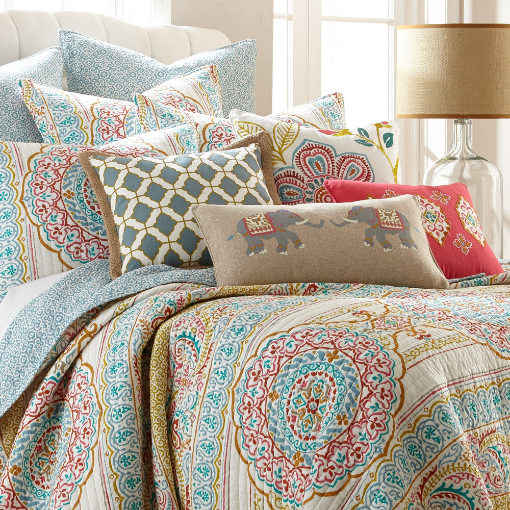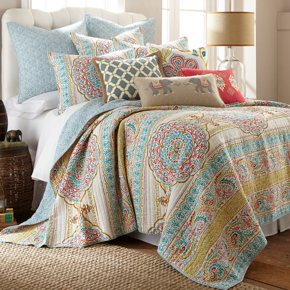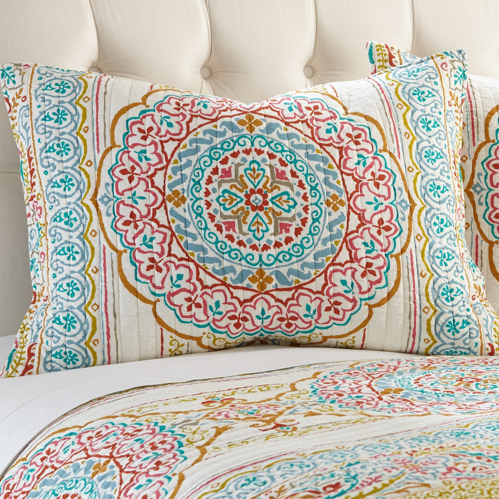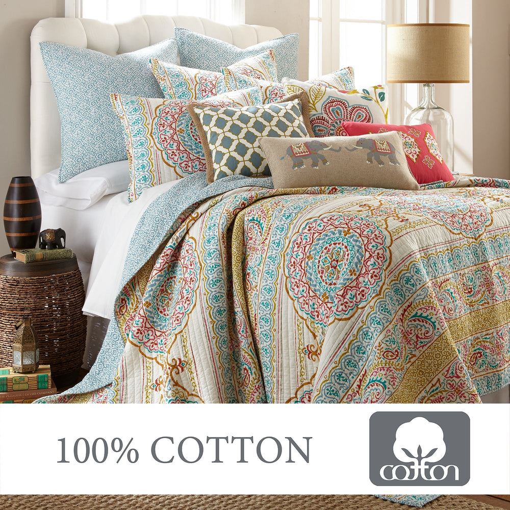 The Tangier Reversible Quilt Set by Levtex Home is inspired by a kaleidoscope. This intricate medallion design will immediately transform your bedroom. Made with the softest lightweight cotton and filled with a cotton-rich filler (that includes cotton, polyester and other fibers), this reversible quilt features blue, red, and orange medallions on a cream ground with stripes of paisleys, medallions, and leaf patterns, reversing to a pattern of light blue mini medallions on the other. The Quilt Set is machine washable. Enjoy this for years to come!
