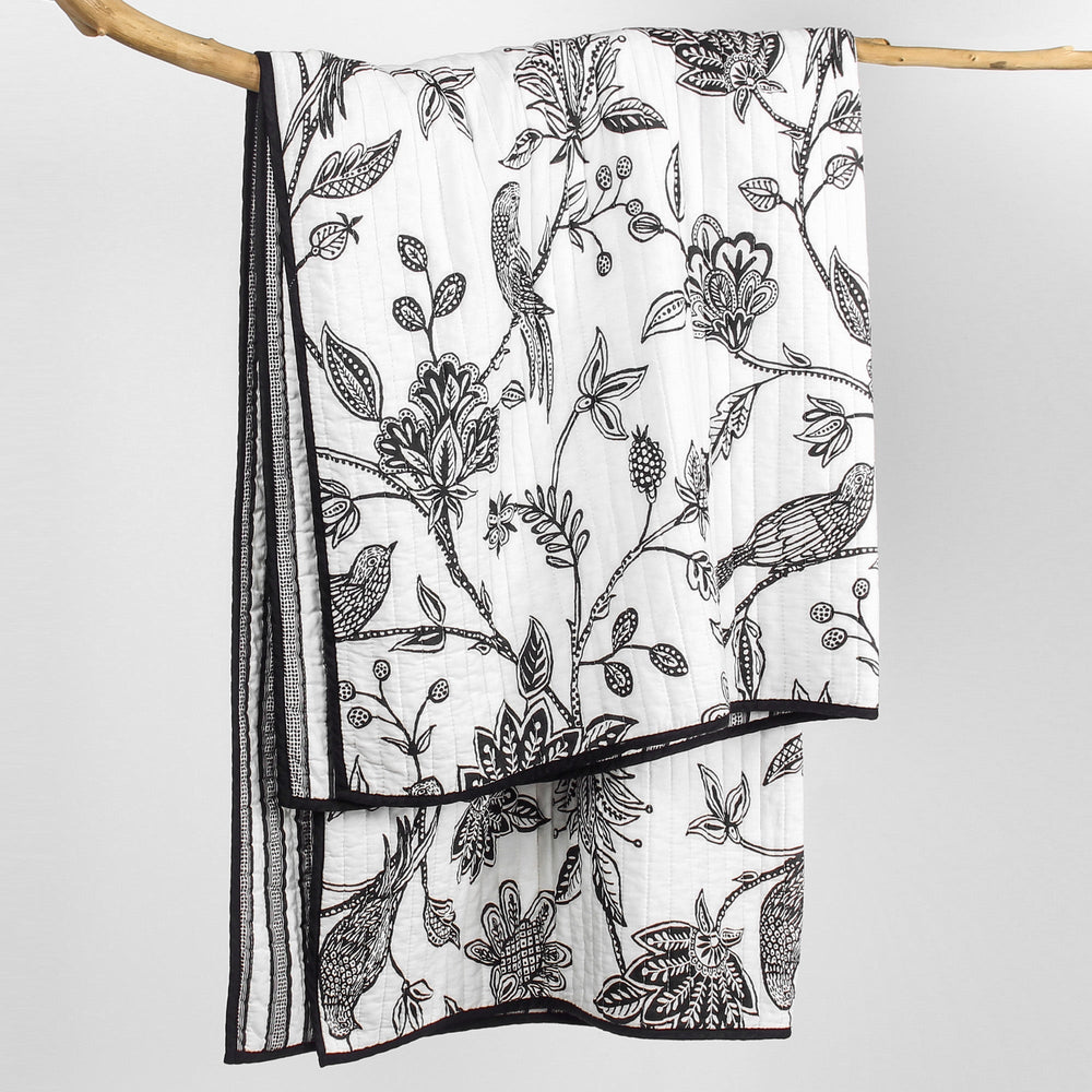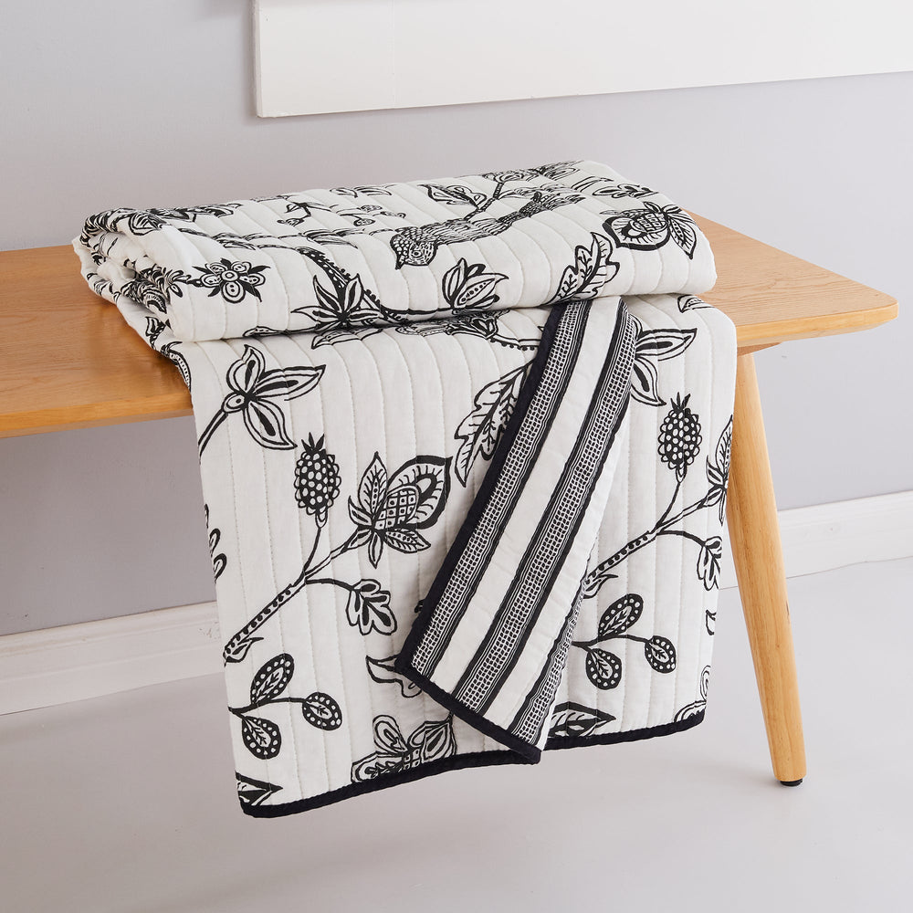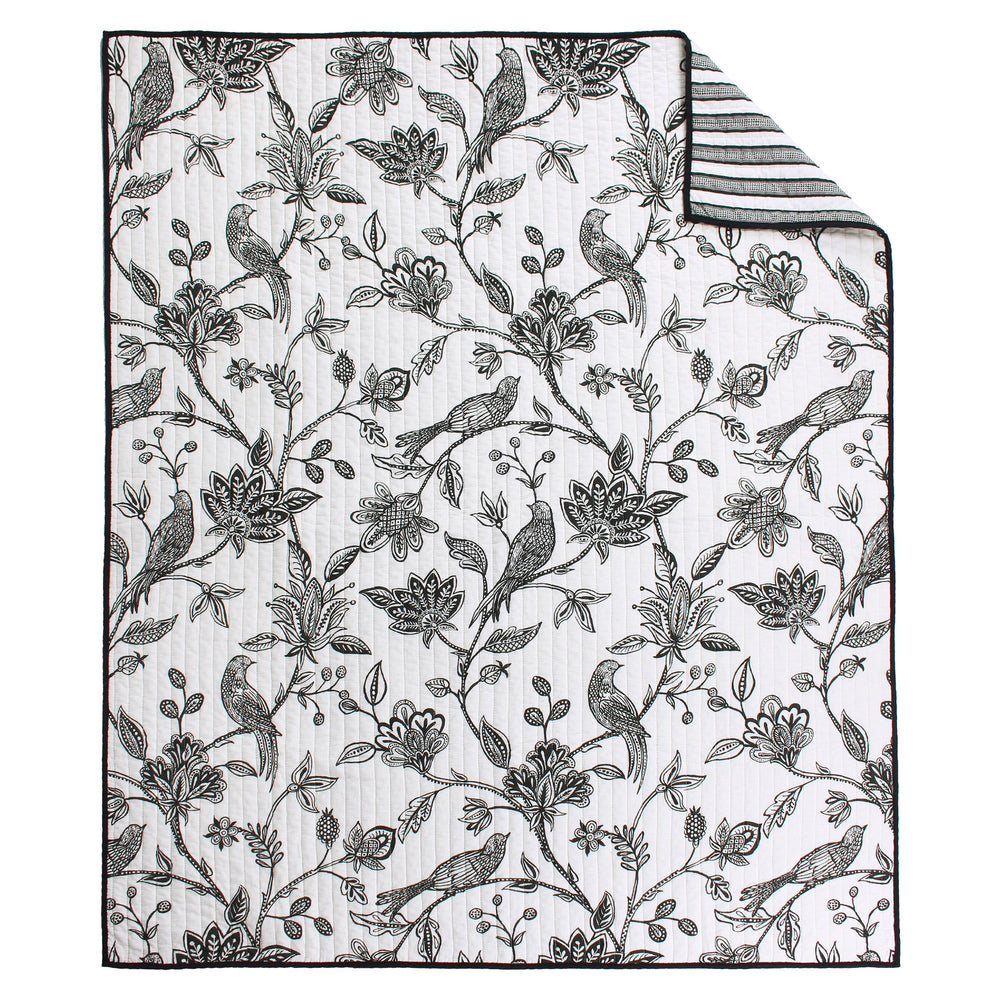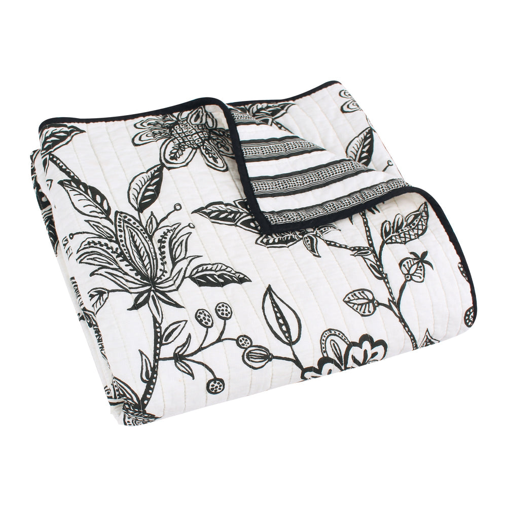 The Tanzie Black Reversible Throw by Levtex Home is inspired by traditional batik prints. Offered in shades of black and white, this design will immediately transform your bedroom. Made with the softest lightweight cotton, this reversible quilt features intricately detailed flowers and birds on the one side, reversing to a black and white stripe on the other. The Throw (50x60in.) has a cotton front and cotton back, filled with a cotton-rich filler, and is machine washable. Enjoy this for years to come!