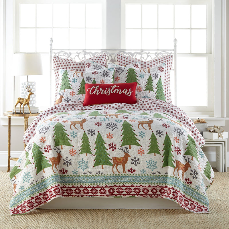 The Tinsel Reversible Quilt Set by Levtex Home is inspired by a cheerful and festive forest scene. Offered in shades of traditional red and green, mixed with fun aqua, orange and grey accents, this design will immediately transform your bedroom. Made with the softest lightweight brushed microfiber, this reversible quilt features a collection of colorful snowflakes, ornaments and decorative reindeer on the front, reversing to a red snowflakes on a white ground on the other. The Quilt Set is filled with a cotton-rich filler (that includes cotton, polyester and other fibers) and is machine washable. Bring the holidays home!