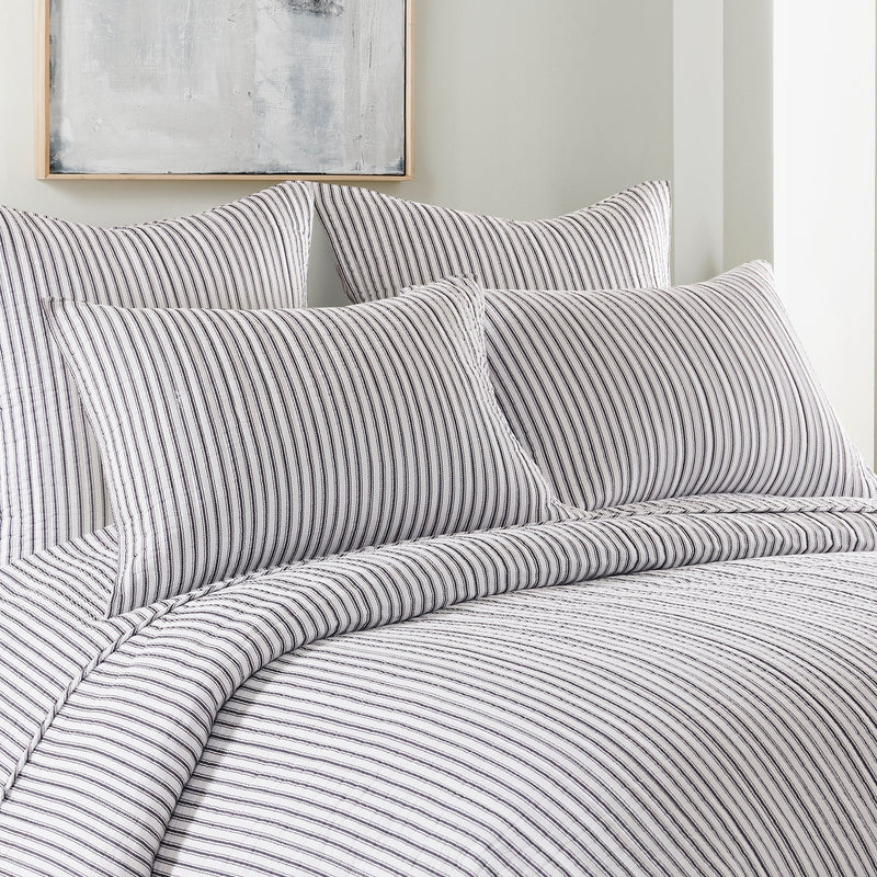 The Tobago Stripe Charcoal Reversible Quilt Set by Levtex Home is inspired by nautical stripes. This classic stripe design will immediately transform your bedroom. Made with the softest lightweight cotton and filled with a cotton-rich filler (that includes cotton, polyester and other fibers), this reversible quilt features dark grey pin stripes on white, reversing to a classic charcoal and white pin stripe on the other. The Quilt Set is machine washable. Enjoy this for years to come!