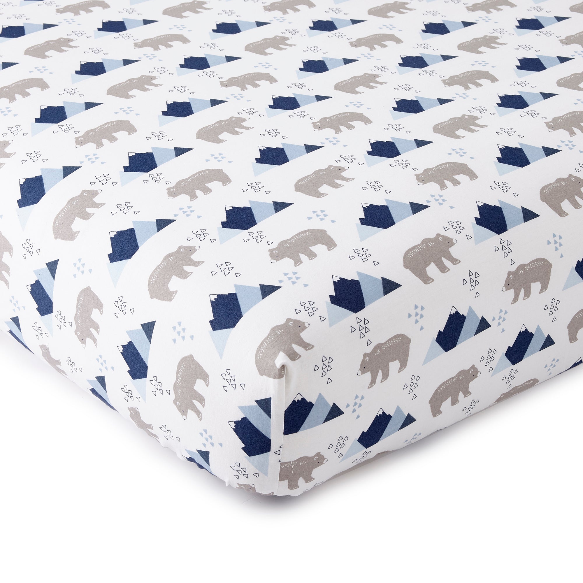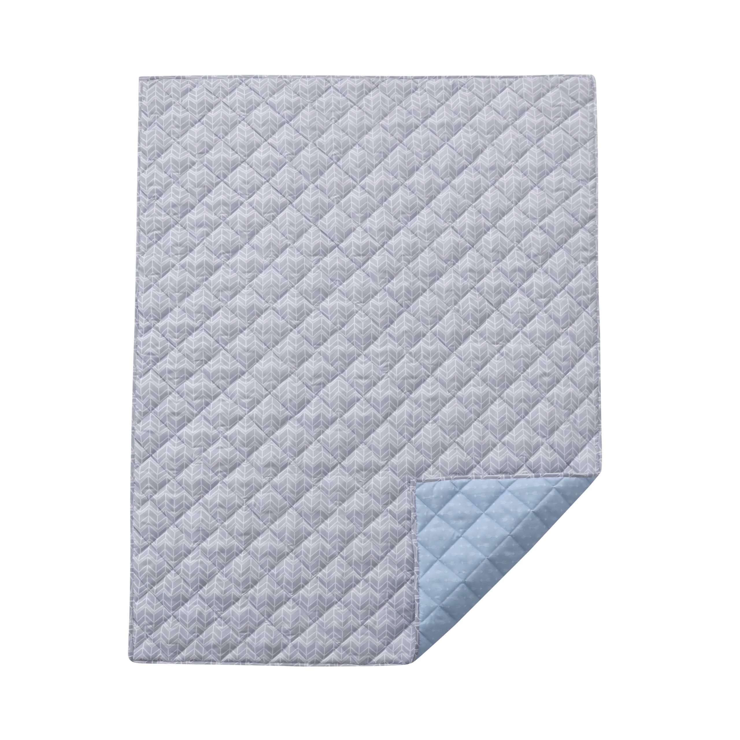 You will think that you are hiking on a mountain trail with our adorable look. The 5 piece set includes a fitted sheet, a flat sheet and a pillow case that all feature a cool toss of bears and mountains in shades of grey and blue; a quilt that is a fully reversible with a hip arrow print in blue on one side and a bear/mountain toss print on the other; and a decorative pillow that features a cool set of antlers and the words ADVENTURE AWAITS embroidered in blue and white on a grey canvas ground. The perfect transition into your first big kid bed.