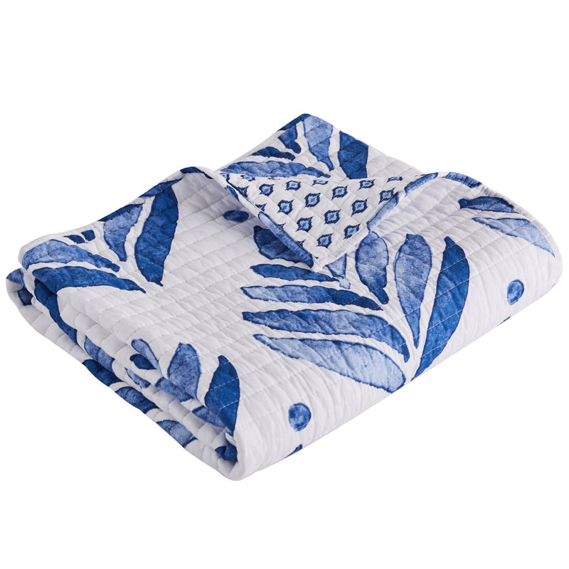 The Vintage Blossom Reversible Throw by Levtex Home is inspired by a collection of bamboo fans. Offered in classic blue and white, this design will immediately transform any room in your home. This throw features a sophisticated fan pattern on the front, reversing to a small blue and white medallion on white on the back. The Throw (50x60in.) has a cotton front and cotton back, filled with a cotton-rich filler, and is machine washable. Enjoy this for years to come!