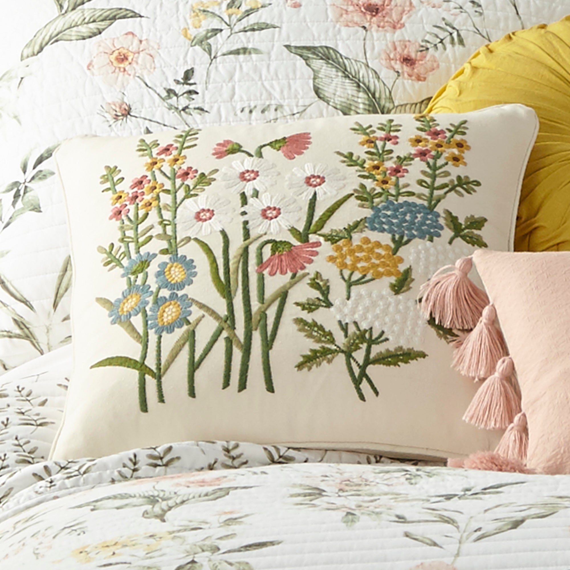 The Embroidered Flowers decorative pillow perfectly complements the Levtex Home Viviana bedding collection. This pillow is sized at 18 x 18in. and features an intricately detailed botanical floral. The coral, green, blue, gold and cream color palette makes this a versatile accessory for your bed, couch or favorite chair. The pillow comes pre-filled with a soft, luxurious feather inner.