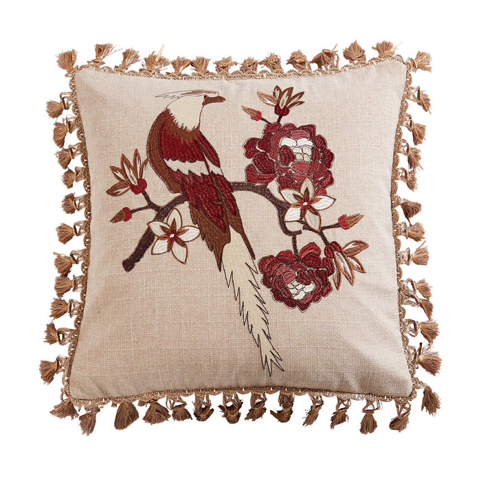 The Bird decorative pillow matches perfectly with the Levtex Home Astrid bedding collection. This pillow is sized at 18x18in. and features a regal bird embroidered in rich colors on a textured ground, edged in a brocade trim. The burgundy red, brown, cream and taupe color palette makes this a versatile accessory for your bed, couch or favorite chair. The pillows comes pre-filled with a soft luxurious feather inner.