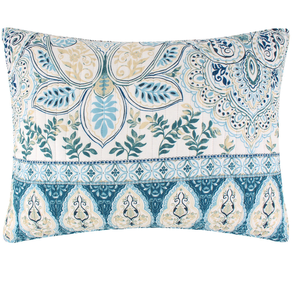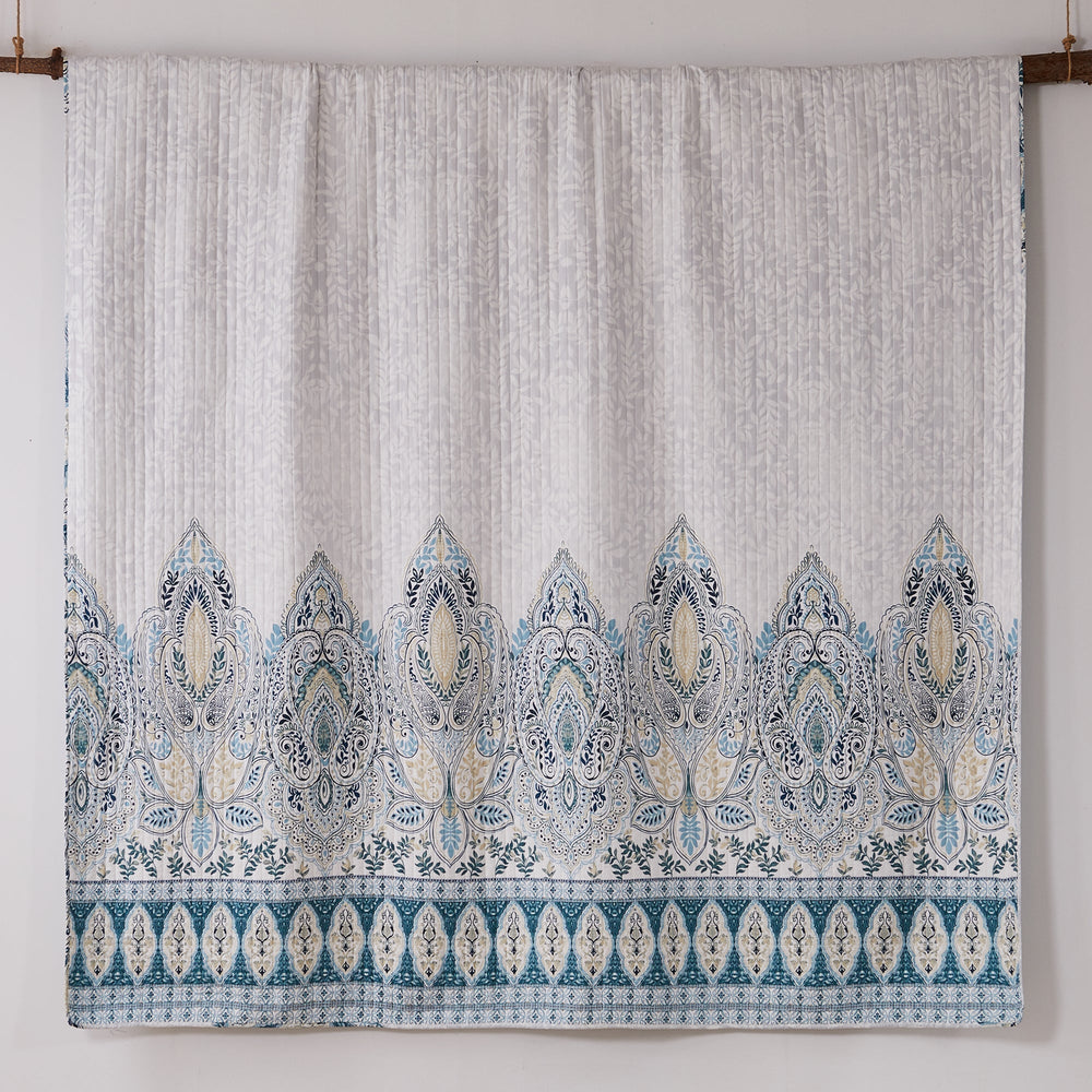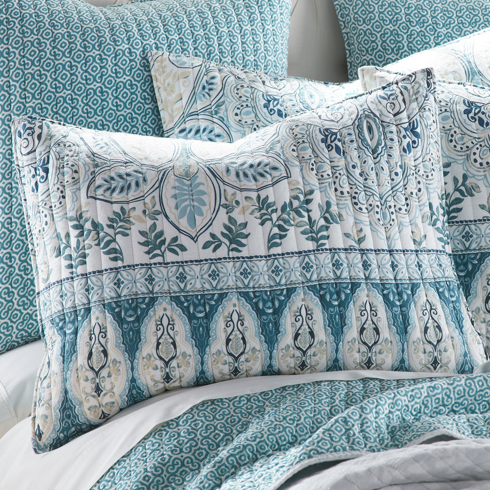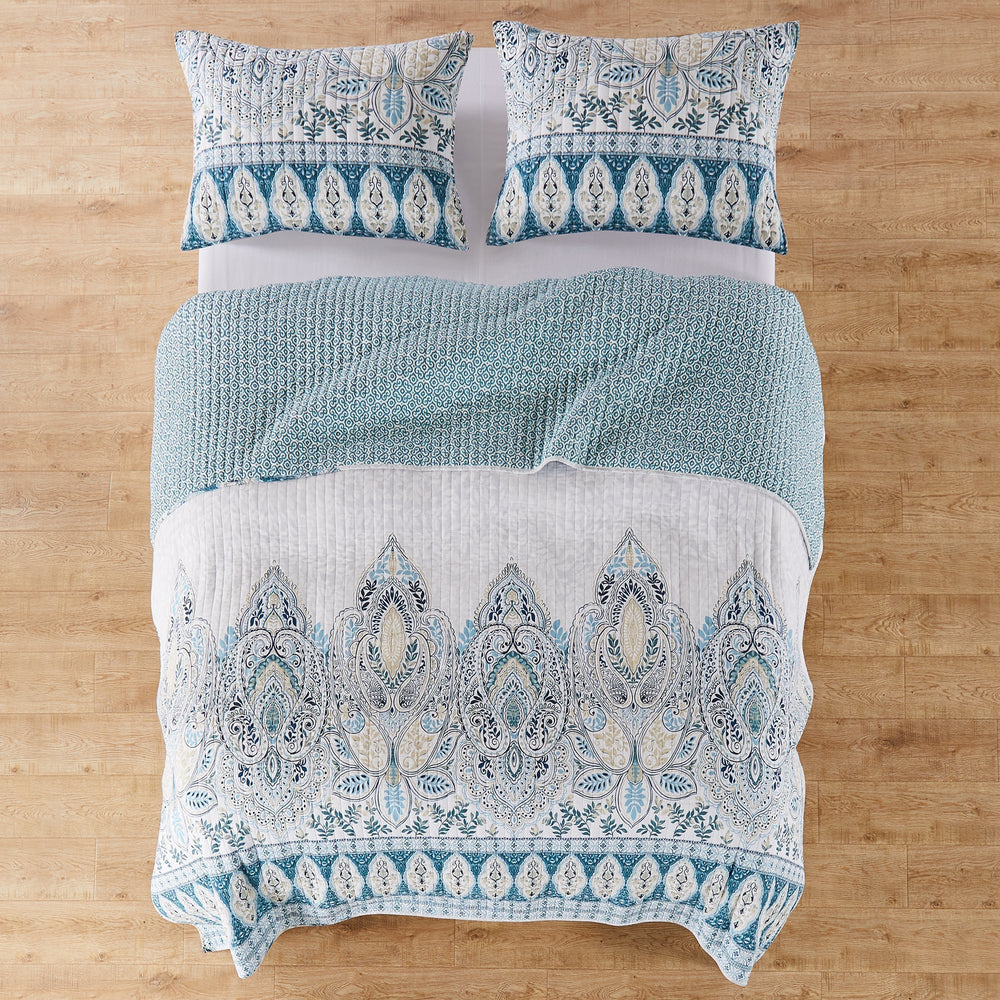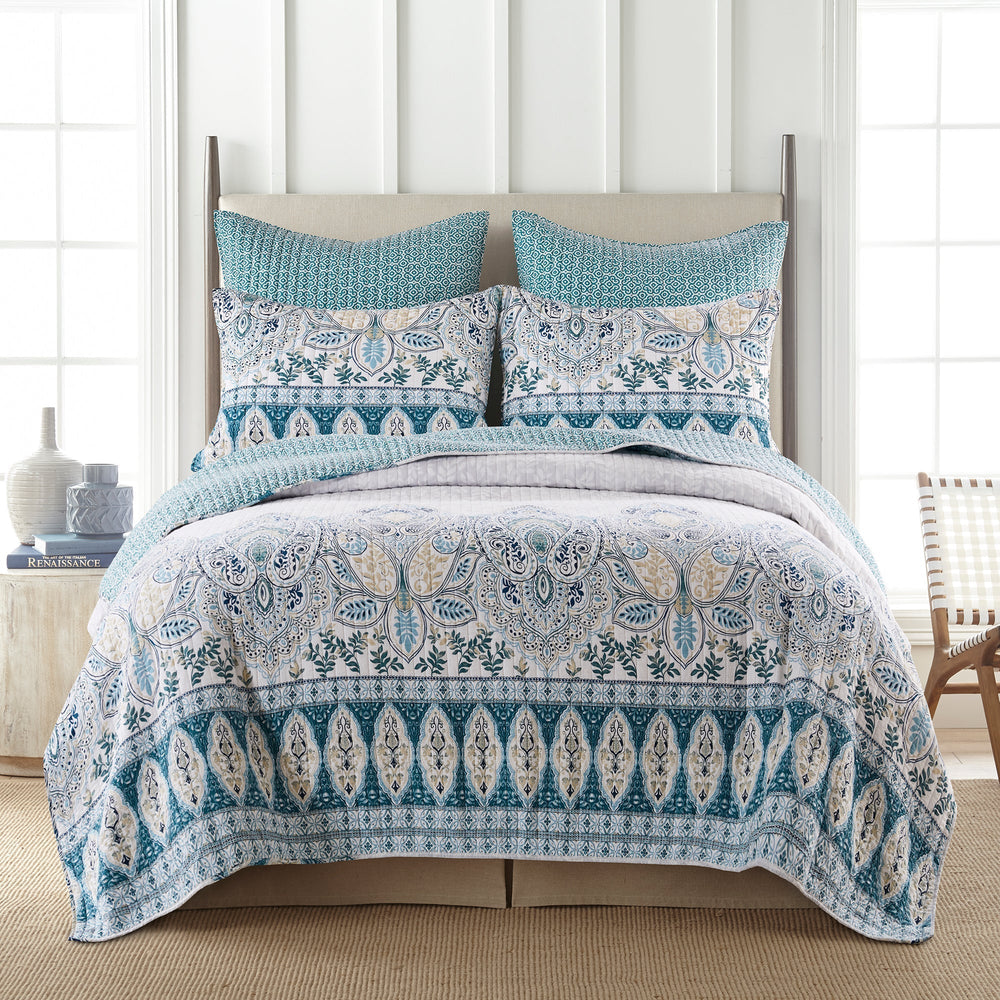 The Wentworth Reversible Quilt Set by Levtex Home is inspired by delicate murals. This beautiful blue design will immediately transform your bedroom. Made with the softest lightweight cotton and filled with a cotton-rich filler (that includes cotton, polyester and other fibers), this reversible quilt features a beautiful intricate paisley pattern on the bottom of the quilt with a soft grey leaf-pattern ground, reversing to a teal medallion pattern on the other. The Quilt Set is machine washable. Enjoy this for years to come!