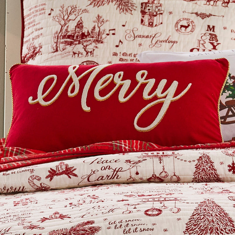 The Yuletide decorative pillow matches perfectly with the Levtex Home Yuletide bedding collection or can be used to bring the holiday spirit into any room in your home. This pillow is sized at 12x24in. and features MERRY embroidered in white and gold on a rich red ground and edged in gold brocade. Pairs perfectly with the Yuletide Christmas pillow to spell out MERRY CHRISTMAS! A versatile accessory for your bed, couch or favorite chair. The pillow comes pre-filled with a soft. luxurious feather inner. Bring the holidays home!