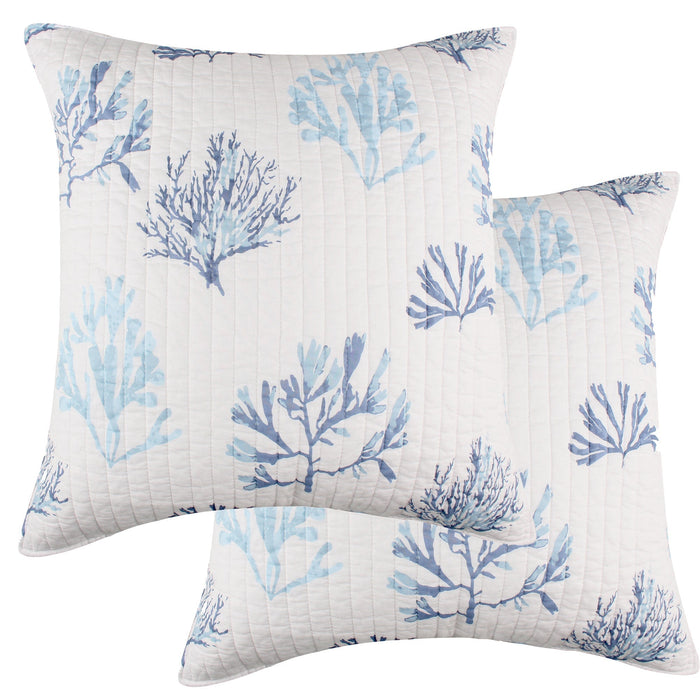 The Zuma Beach euro shams are the perfect complement to the Levtex Home Zuma Beach collection. This is the perfect accessory to add a layer of dimension and truly complete your bedroom. Sized at 26 x 26 in., the euro shams feature beautiful coral in shades of blue printed on a white ground. Made from 100% cotton, the Zuma Beach euro shams are easy to care for. They come as a set of 2 without a filler.